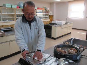 お昼に召し上がっていただいたそばは、私たちが「常陸秋そば発祥の地」常陸太田市赤土町の畑で、手刈り天日干しで栽培した蕎麦を自家製粉しました。曳き方も やや粗めと超粗めの2種類をブレンドしました。茹で上がったそばは、少し透明がかったモチモチ感のある食感に仕上がっていたと思います。かも南蛮も炭火で焼き立てを、熱々で召し上がっていただくことが出来ました。